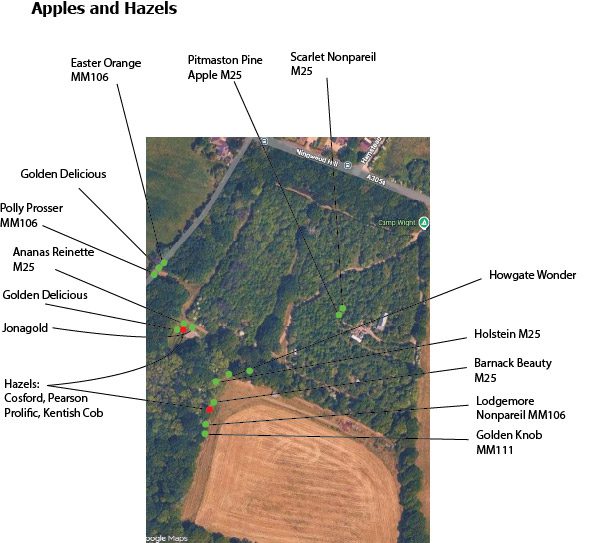 Map of Apple Varieties and rootstocks and Hazel Planting